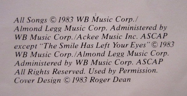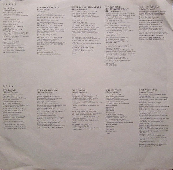 Tracklist: . Alpha, A1. Don't Cry, A2. The Smile Has Left Your Eyes, A3. Never In A Million Years, A4. My Own Time (I'll Do What I Want), A5. The Heat Goes On, . Beta, B1. Eye To Eye, B2. The Last To Know, B3. True Colors, B4. Midnight Sun, B5. Open Your Eyes
