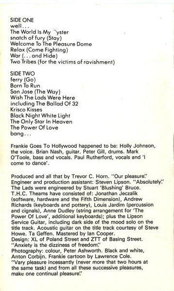 Tracklist: A1. Well..., A2. The World Is My Oyster, A3. Snatch Of Fury (Stay), A4. Welcome To The Pleasure Dome, A5. Relax (Come Fighting), A6. War (And Hide), A7. Two Tribes (For The Victims Of Ravishment), B1. Ferry (Go), B2. Born To Run, B3. San Jose (The Way), B4. Wish The Lads Were Here, B5. Including The Ballad Of 32, B6. Krisco Kisses, B7. Black Night White Light, B8. The Only Star In Heaven, B9. The Power Of Love, B10. Bang...
