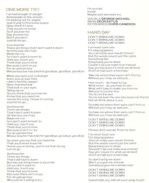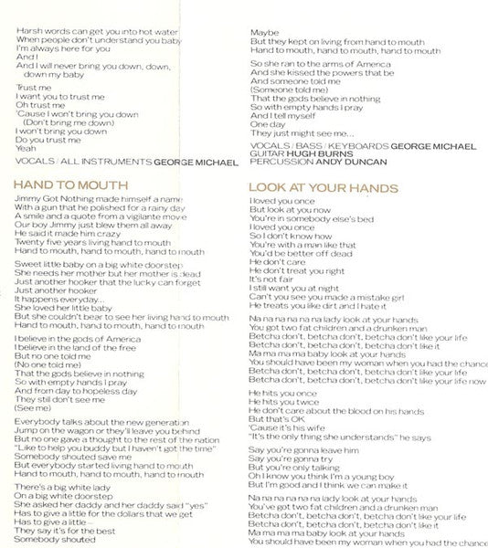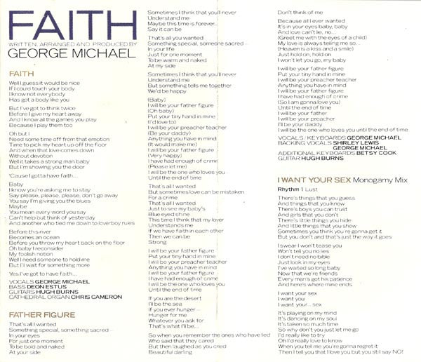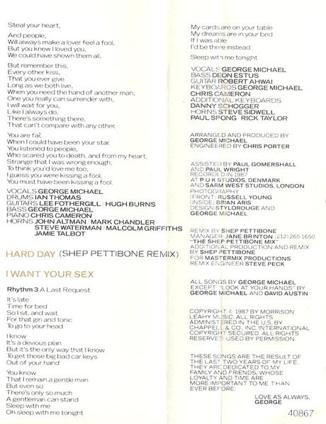 Tracklist: A1. Faith, A2. Father Figure, A3. I Want Your Sex (Parts 1 & 2), A4. One More Try, A5. Hard Day, B1. Hand To Mouth, B2. Look At Your Hands, B3. Monkey, B4. Kissing A Fool, B5. Hard Day (Shep Pettibone Remix), B6. A Last Request (I Want Your Sex Part 3)