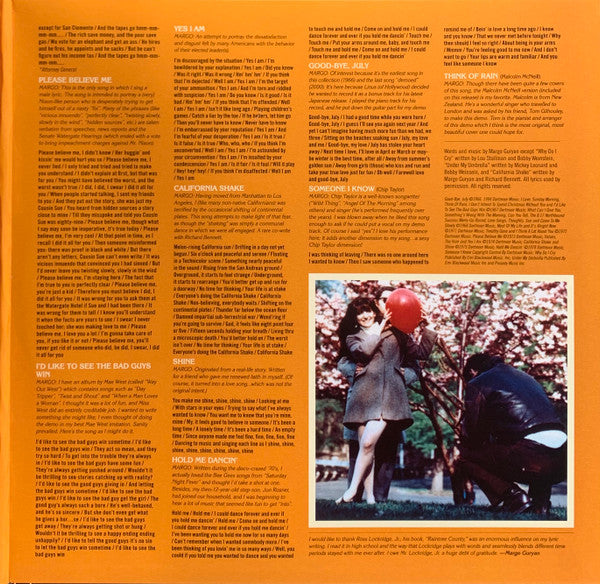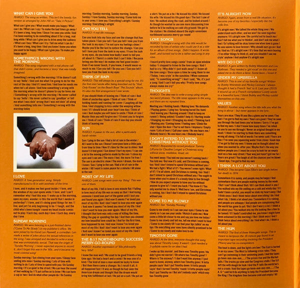 Tracklist: A1. What Can I Give You, A2. Something's Wrong With The Morning, A3. I Love, A4. Sunday Morning, A5. Can You Tell, A6. Think of Rain, A7. Sun, B1. Most Of My Life, B2. The 8:17 Northbound Success Merry-Go-Round, B3. Love Songs, B4. Thoughts, B5. I Don't Intend To Spend Christmas Without You, B6. Come To Me Slowly, B7. Timothy Gone, B8. It's Alright Now, C1. Why Do I Cry, C2. Under My Umbrella, C3. Values, C4. I Think A Lot About You, C5. The Hum, C6. Please Believe Me, C7. I'd Like To See the Bad Guys Win, D1. Yes I Am, D2. California Shake, D3. Shine, D4. Hold Me Dancin', D5. Good-Bye, July, D6. Someone I Know (Chip Taylor Demo), D7. Think Of Rain (Malcolm McNeill Demo)