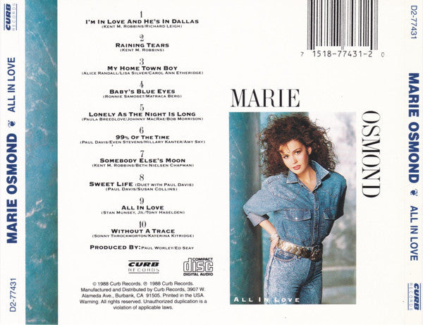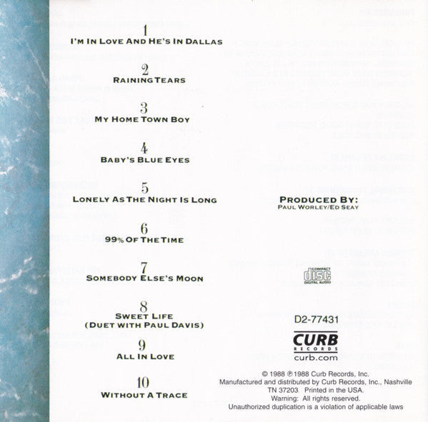 Tracklist: 1. I'm In Love And He's In Dallas, 2. Raining Tears, 3. My Home Town Boy, 4. Baby's Blue Eyes, 5. Lonely As The Night Is Long, 6. 99% Of The Time, 7. Somebody Else's Moon, 8. Sweet Life, 9. All In Love, 10. Without A Trace