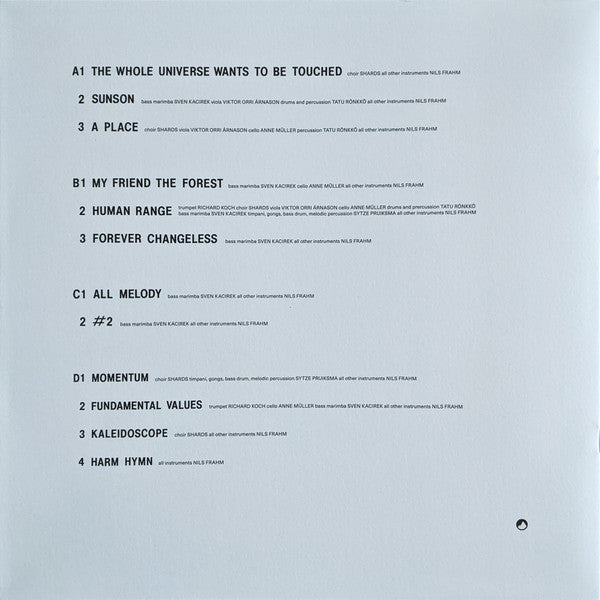 Tracklist: A1. The Whole Universe Wants To Be Touched, A2. Sunson, A3. A Place, B1. My Friend The Forest, B2. Human Range, B3. Forever Changeless, C1. All Melody, C2. #2, D1. Momentum, D2. Fundamental Values, D3. Kaleidoscope, D4. Harm Hymn