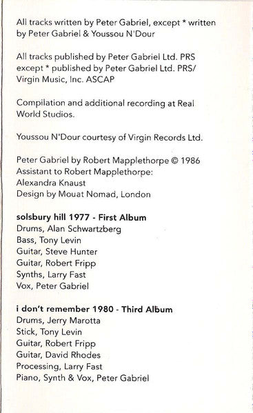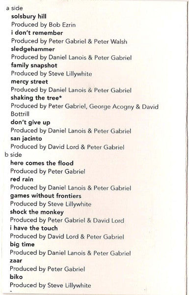Tracklist: A1. Solsbury Hill, A2. I Don't Remember, A3. Sledgehammer, A4. Family Snapshot, A5. Mercy Street, A6. Shaking The Tree, A7. Don't Give Up, A8. San Jacinto, B1. Here Comes The Flood, B2. Red Rain, B3. Games Without Frontiers, B4. Shock The Monkey, B5. I Have The Touch, B6. Big Time, B7. Zaar, B8. Biko