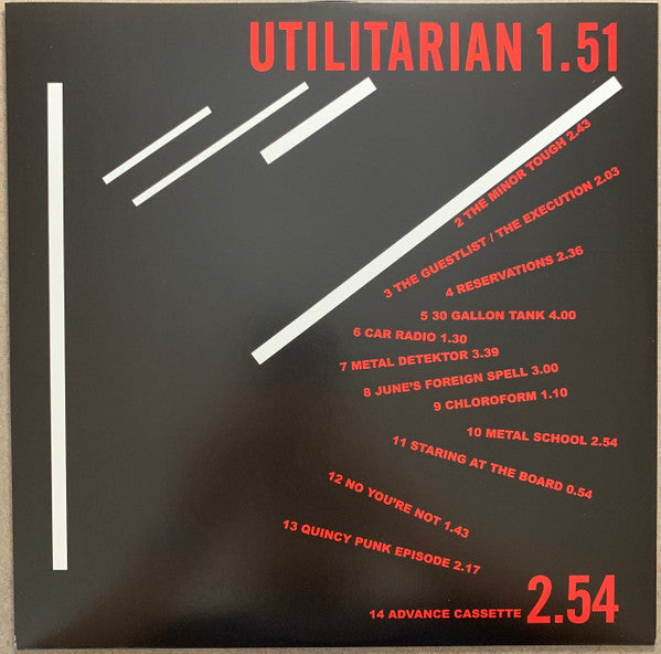 Tracklist: A1. Utilitarian, A2. The Minor Tough, A3. The Guestlist / The Execution, A4. Reservations, A5. 30 Gallon Tank, A6. Car Radio, A7. Metal Detektor, B8. June's Foreign Spell, B9. Chloroform, B10. Metal School, B11. Staring At The Board, B12. No You're Not, B13. Quincy Punk Episode, B14. Advance Cassette