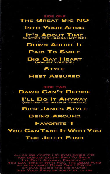 Tracklist: A1. The Great Big NO, A2. Into Your Arms, A3. It's About Time, A4. Down About It, A5. Paid To Smile, A6. Big Gay Heart (Against Violence), A7. Style, A8. Rest Assured, B1. Dawn Can't Decide, B2. I'll Do It Anyway, B3. Rick James Style, B4. Being Around, B5. Favorite T, B6. You Can Take It With You, B7. Jello Fund