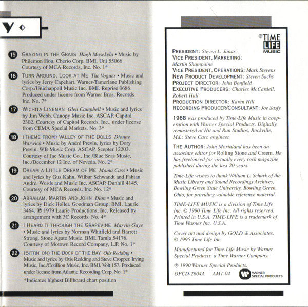 Tracklist: 1. A Beautiful Morning, 2. Spooky, 3. Light My Fire, 4. The Look Of Love, 5. Like To Get To Know You, 6. Classical Gas, 7. Angel Of The Morning, 8. I Wish It Would Rain, 9. Ain't Nothing Like The Real Thing, 10. Do You Know The Way To San Jose, 11. Honey, 12. Hooked On A Feeling, 13. Stoned Soul Picnic, 14. Goin' Out Of My Head / Can't Take My Eyes Off You, 15. Grazing In The Grass, 16. Turn Around, Look At Me, 17. Wichita Lineman, 18. (Theme From) Valley Of The Dolls, 19. Dream A Little Dream Of Me, 20. Abraham, Martin And John, 21. I Heard It Through The Grapevine, 22. (Sittin' On) The Dock Of The Bay