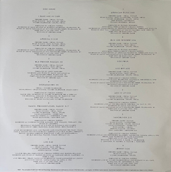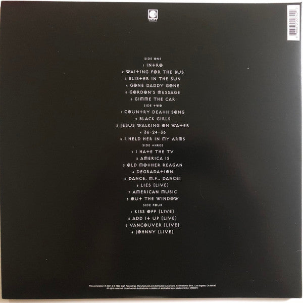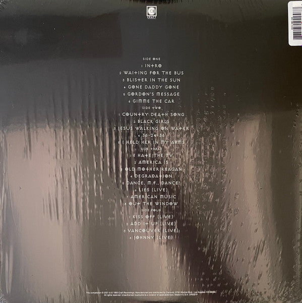 Tracklist: A1. Intro, A2. Waiting For The Bus, A3. Blister In The Sun, A4. Gone Daddy Gone, A5. Gordon's Message, A6. Gimme The Car, B1. Country Death Son, B2. Black Girls, B3. Jesus Walking On Water, B4. 36-24-36, B5. I Held Her In My Arms, C1. I Hate The TV, C2. America Is, C3. Old Mother Reagan, C4. Degradation, C5. Dance, M.F., Dance, C6. Lies (Live), C7. American Music, C8. Out The Window, D1. Kiss Off (Live), D2. Add It Up (Live), D3. Vancouver (Live), D4. Johnny (Live)
